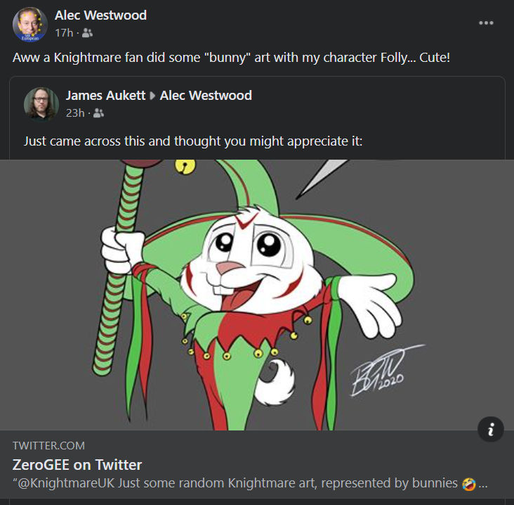 I informed Alec Westwood of the Folly art and he's subsequently shared it on his Facebook:Fidjit wrote: 10 Jan 2021, 13:05 Something Knightmare and creative for you in that case
