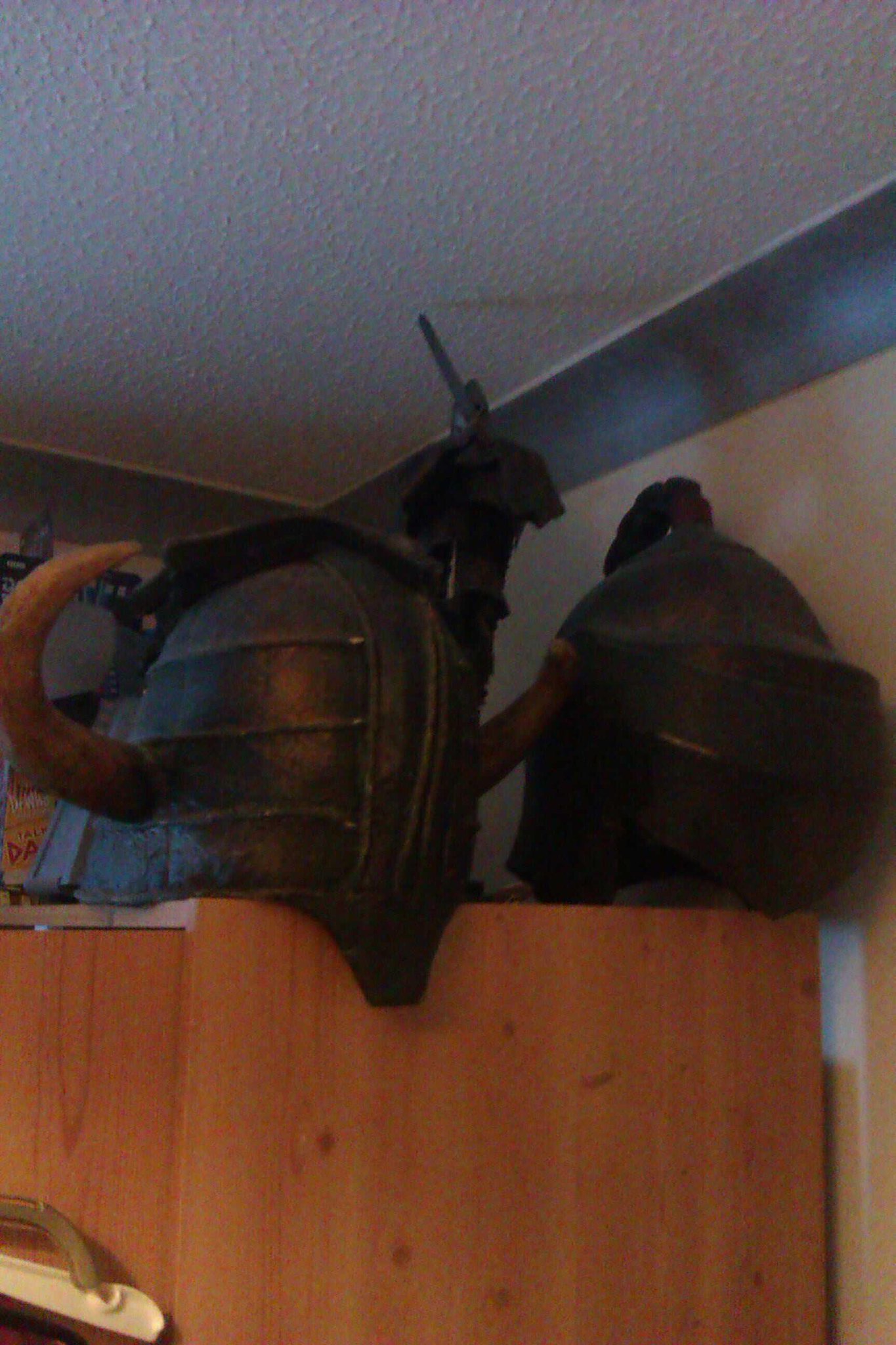 The two iconic helmets of justice, the dungeoneers one true protection from the forces of the unreality and confusion in the dungeons...a running constant throughout and one of the few items that has seen many quests start and end in various ways, and which have been worn by countless challengers with mixed levels of worthiness...side by side on top of a cupboard, as far away from the adventure and dungeoneering as can possibly be.