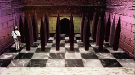 Just a taster of the kind of effect that the floor puzzles have on our intrepid dungeoneers. Floor puzzles have always been an important part of the Knightmare dungeon and they have developed enormously since the first couple of series. The Travelling Matte Company, who are responsible for generating the graphics for puzzles, chambers and wall monsters have been working on the programme since its first planning stages. The designers work closely with Tim Child to put his ideas on to the screen. Tim will have an idea about how to test the team's skill with moving spikes, paving stones or causeways and the design team will spend hours creating the three dimensional building blocks that go to make up a playable game.