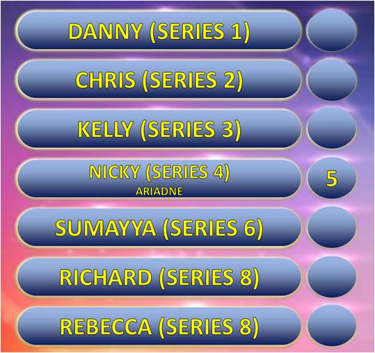 I think I know them all but have no idea which will be the lowest scoring. I'll go for Nicky - Ariadne.