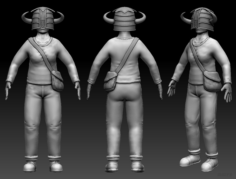 Extra detail like cloth wrinkles and textures will get added later because I re-sculpt some parts after posing.