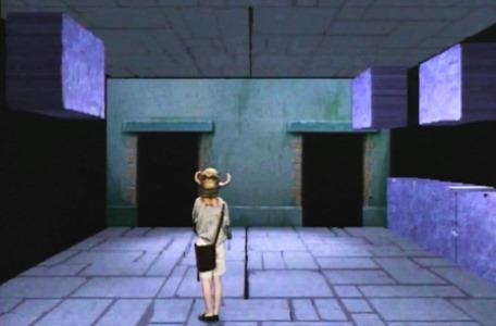 Vicky lands on a square ledge above a pit. Gundrada the Sword Mistress mistakes Vicky for a dwarf and threatens to chop off her head.